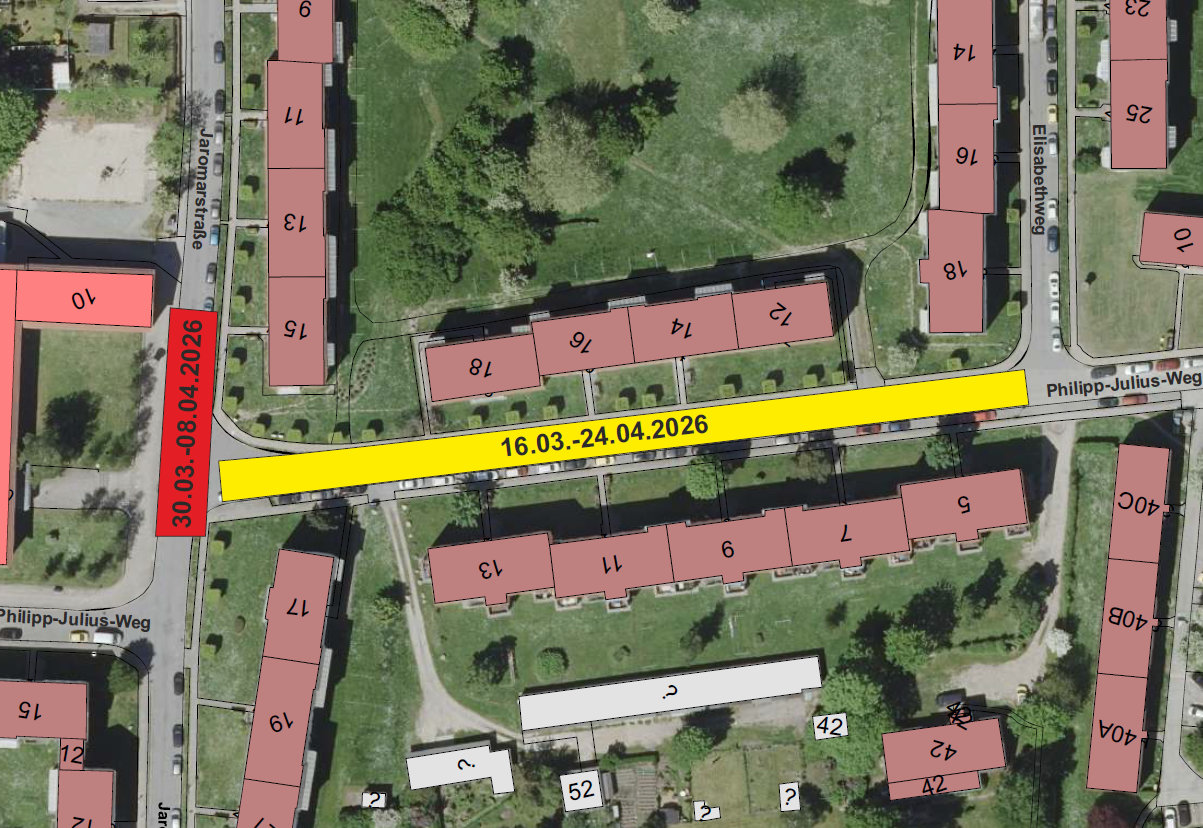 Die Arbeiten zur Verlegung einer Fernwärmeleitung und einer Erneuerung der Trinkwasserleitung im Philipp-Julius-Weg werden ab 16. März fortgesetzt. Gebaut wird dabei im Abschnitt zwischen Elisabethweg und Jaromarstraße. Die Arbeiten werden  unter Vollsperrung der Straße ausgeführt. Bis zum 24. April sollen die Bauarbeiten in diesem Abschnitt abgeschlossen sein.